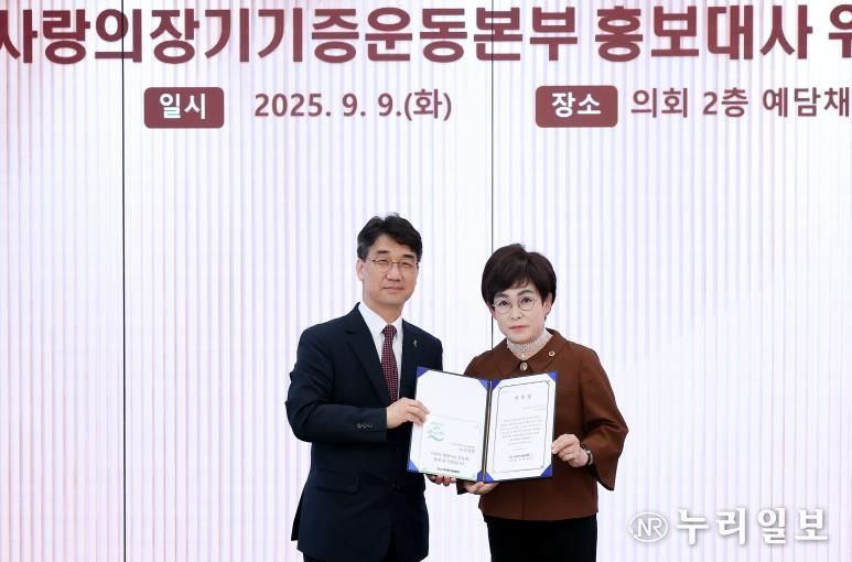 (누리일보) 경기도의회 교육기획위원회 소속 김선희 도의원(국민의힘, 용인7)이 9월 9일 ‘장기기증의 날’을 맞아 재단법인 사랑의 장기기증운동본부 홍보대사로 위촉됐다.