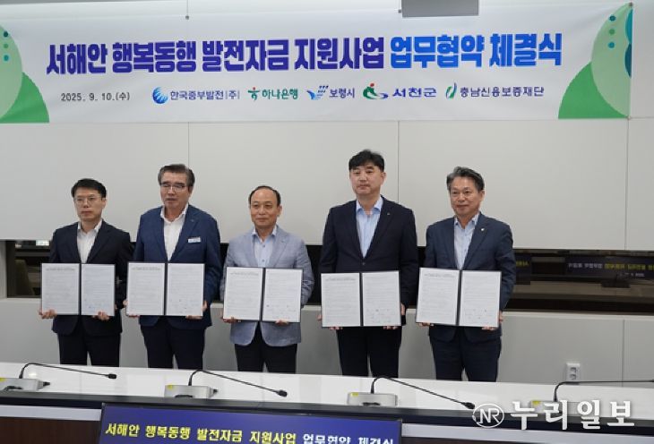 (누리일보) 충남신용보증재단은 10일 중부발전 본사에서 한국중부발전, 하나은행, 보령시, 서천군과 함께 ‘서해안 행복동행 발전자금 지원사업’을 위한 5자간 업무협약을 체결했다고 밝혔다.