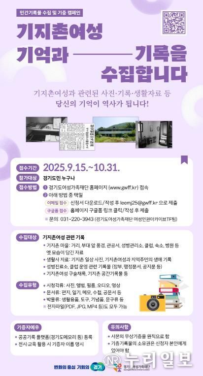 (누리일보) 경기도와 경기도여성가족재단은 ‘기지촌여성 인권 기록 아카이브 구축사업’의 하나로, ‘기지촌여성 민간기록물 수집 및 기증 캠페인’을 9월 15일부터 10월 31일까지 추진한다.