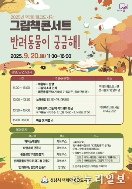 (누리일보) 성남시는 오는 9월 20일 오전 11시~오후 4시 분당구 율동공원 내 책테마파크도서관에서 ‘반려동물이 궁금해!’ 주제로 한 그림책 콘서트를 연다.