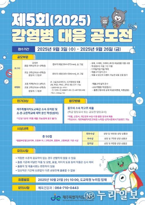 (누리일보) 제주특별자치도교육청은 오는 26일까지 학생들이 안전하고 건강한 학교와 사회를 만들 방법을 스스로 생각하고 실천할 수 있는 기회를 제공하기 위해 ‘제5회 감염병 대응 공모전’을 개최한다.