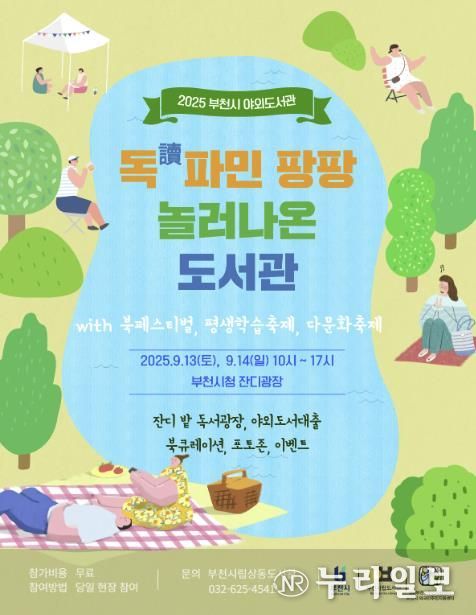 (누리일보) 부천시는 책과 자연 속 휴식을 함께 누릴 수 있는 ‘놀러나온 도서관’ 행사를 9월 13일과 14일, 양일간 오전 10시부터 오후 5시까지 부천시청 잔디광장에서 개최한다. 이번 행사는 ‘독讀파민 팡팡, 놀러나온 도서관’을 주제로 시민들이 일상에서 독서를 더욱 친근하게 접할 수 있도록 마련됐다.
