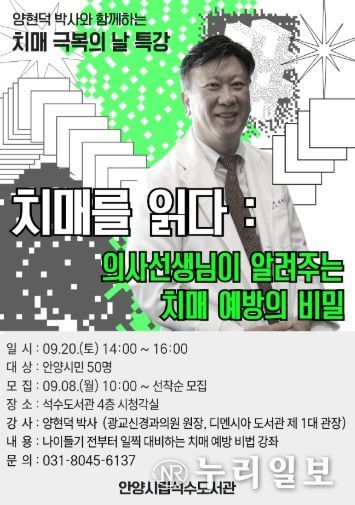 (누리일보) 안양시 석수도서관은 9월 21일 ‘치매극복의 날’을 기념하여 오는 20일 오후 2시 ‘치매를 읽다 : 의사 선생님이 알려주는 치매 예방의 비밀’ 특강을 개최한다고 11일 밝혔다.