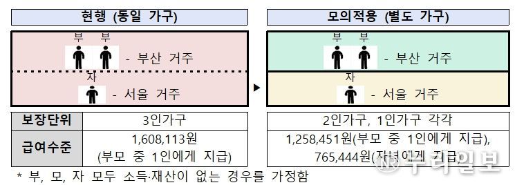 (누리일보) 보건복지부는 9월 15일, 생계급여 수급가구에 속한 청년이 부모와 따로 사는 경우 해당 청년을 부모와 별도 가구로 보아 급여를 분리 지급하는 등의 방안을 모의적용할 예정이라고 밝혔다.