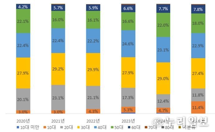 올해 상반기 연령별 출원 현황을 살펴보면, 남성 디자인 출원인은 50대 비중이 가장 높지만 여성은 30대 이하가 과반(50.6%, ‘25년 6월 기준)을 차지해 젊은 층의 비중이 압도적으로 높게 나타났다.