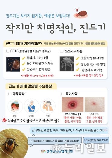 (누리일보) 충남도 농업기술원은 가을철을 맞아 진드기 매개 감염병 예방수칙을 철저히 준수해 줄 것을 안내했다.
