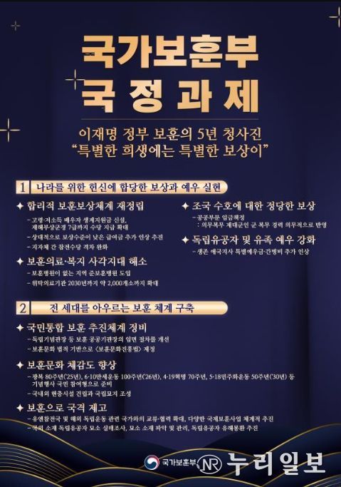 (누리일보) 국가보훈부는 16일 새정부 국정과제로 '나라를 위한 헌신에 합당한 보상과 예우 실현', '전 세대를 아우르는 보훈 체계 구축'이 확정됐다고 밝혔다.