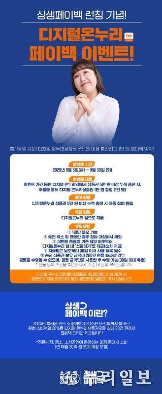 아울러 상생페이백 런칭 기념으로 이달 30일까지 디지털 온누리 앱에서 상품권을 누적 5만원 이상 충전하면 추첨을 통해 1만원의 상품권을 총 1만명에게 지급하는 이벤트를 진행한다.