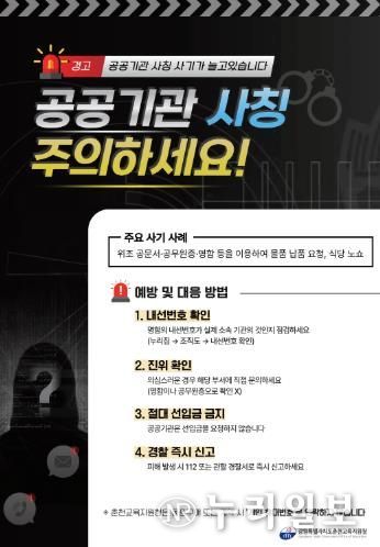 (누리일보) 춘천교육지원청은 최근 춘천교육지원청 직원을 사칭한 위조 명함과 공문서를 이용하여 물품 구매 요청, 식당 예약 불참(no-show) 등 사기 시도가 급증함에 따라, 지역 상인들에게 각별한 주의를 당부했다.