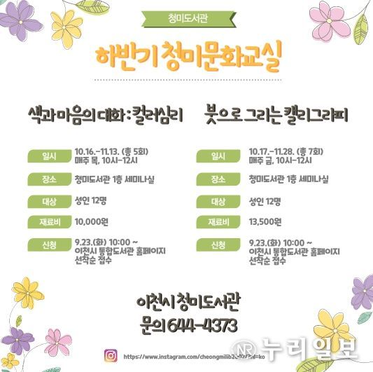 (누리일보) 이천시 청미도서관은 지역 주민들의 문화 향유와 여가생활을 지원하기 위해 오는 10월부터 하반기 청미문화교실을 운영한다.