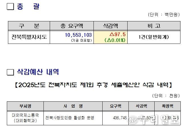 (누리일보) 전북특별자치도의회 예산결산특별위원회(위원장 김명지, 전주11)는 9월 12일과 9월 15일 두 차례 회의를 거쳐, 총 11조 4,781억 원(예산 10조 5,531억 원, 기금 9,250억 원) 규모의 2025년도 제2회 추경예산안을 심사·의결했다.