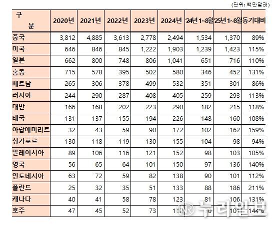 관세청에 따르면 우리나라 화장품 수출액은 올해 8월 말까지 73억 달러를 넘어서며 지난해 같은 기간보다 14% 증가했으며, 중국, 미국, 일본으로의 화장품 수출이 전체 수출액의 48%를 차지하고 있다.