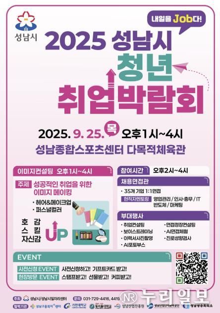 (누리일보) 성남시는 오는 9월 25일 오후 1시부터 4시까지 성남종합스포츠센터 1층 다목적체육관에서 ‘2025 성남시 청년 취업박람회’를 개최한다.