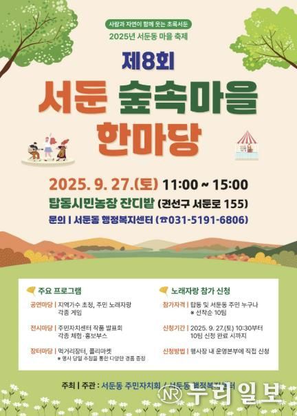 (누리일보) 수원시 권선구 서둔동 주민자치회와 행정복지센터는 오는 9월 27일, 탑동시민농장 잔디밭에서 서둔동 마을 축제 '제8회 서둔 숲속마을 한마당'을 개최한다.