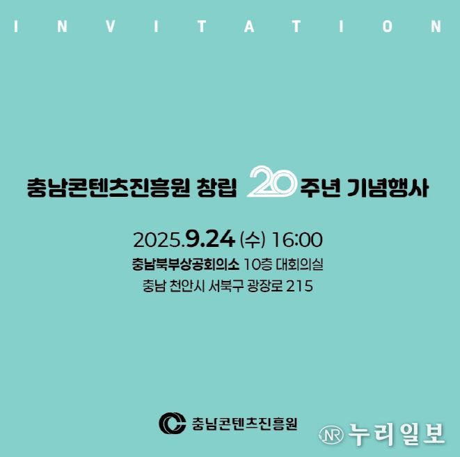 (누리일보) 충남콘텐츠진흥원은 오는 9월 24일 오후 4시 충남북부상공회의소 10층 대회의실에서 창립 20주년 기념행사를 개최한다고 밝혔다.