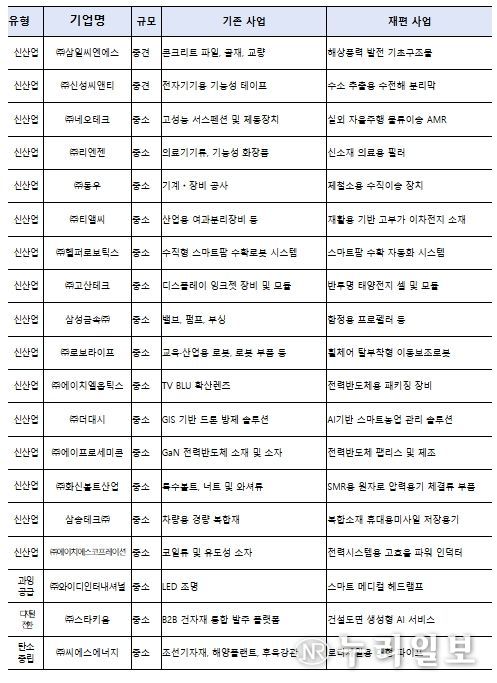 사업재편계획 승인기업의 주요 내용은 다음과 같다. ㈜고산테크는 고효율 태양전지 셀 시장에 진출하고, ㈜신성씨앤티는 수소플랜트의 수전해 핵심부품인 분리막을 국산화한다. ㈜로보라이프는 로봇제어기술을 활용해 수동휠체어에 탈부착이 가능한 이동보조로봇을 개발해 안전성과 편리성을 높이고, ㈜화신볼트산업은 고온 열처리 기술을 바탕으로 SMR 기자재 시장에 진출한다. ㈜에이치엘옵틱스는 실리콘카바이드 전력반도체를 균일하게 접합해 패키징의 불량률을 크게 줄이는 장비를 개발하고, ㈜삼일씨엔에스는 해상풍력발전용 기초구조물을 제작해 해상풍력 공급망을 강화한다.