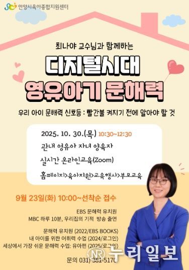 (누리일보) 안양시가 오는 10월 30일 오전 10시 30분 영유아기의 문해력 발달 중요성과 올바른 양육 방법을 알아보는 양육자 1천명 대상 온라인 부모교육을 개최하고, 이달 23일부터 교육생을 선착순으로 신청받는다고 19일 밝혔다.