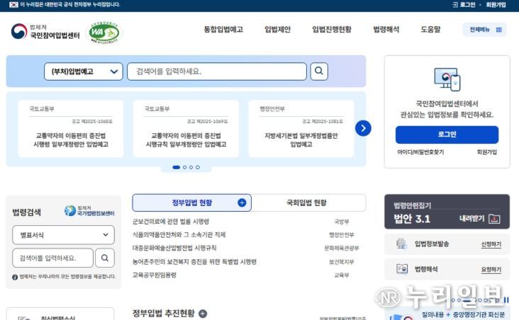 (누리일보) 법제처는 9월 19일, 국민이 입법추진 현황 등 정부입법 관련 정보를 보다 쉽고 편리하게 확인할 수 있도록 기존 국민참여입법센터를 전면 개편하고, 정부입법지원센터를 ‘국민참여입법센터’로 통합하여 새롭게 서비스를 시작한다.