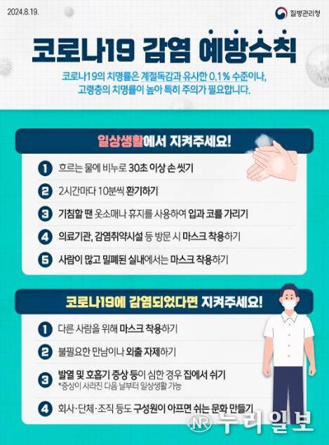 임승관 질병관리청장은 “코로나19 확산세가 가을 초입까지도 지속되고 있다.”며, “국민께서는 일상에서 손씻기, 실내 환기, 기침 예절 등 코로나19 감염 예방수칙 생활화로, 코로나19 전파를 예방하고 고위험군을 보호하여, 환절기를 건강하게 보낼 수 있기를 바란다.”고 전하고, “만약, 코로나19에 감염된 경우는 주요 증상이 호전될 때까지 집에서 쉬며 주위와 접촉을 최소화하고, 회사나 단체 등에서도 아프면 집에서 쉴 수 있도록 배려하는 환경을 조성해 달라.”고 당부했다.