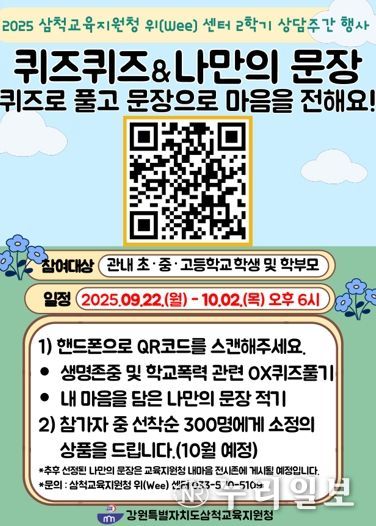 (누리일보) 삼척교육지원청 위(Wee)센터에서는 9월 22일에서 10월 2일까지 진행되는 ‘2학기 상담주간’을 맞아, 학생 참여형 심리 프로그램인 ‘퀴즈퀴즈&나만의 문장’을 새롭게 운영한다고 밝혔다.