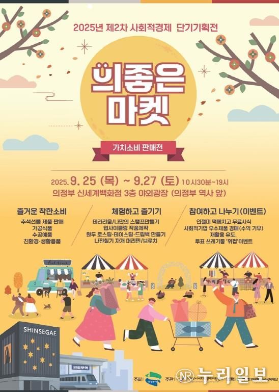 (누리일보) 의정부시는 9월 25일부터 27일까지 3일간 신세계백화점 의정부점 야외광장 3층에서 2025년 제2차 사회적경제 단기기획전 ‘의좋은마켓’을 개최해 사회적경제기업의 판로 확대와 지역경제 활성화에 나선다.