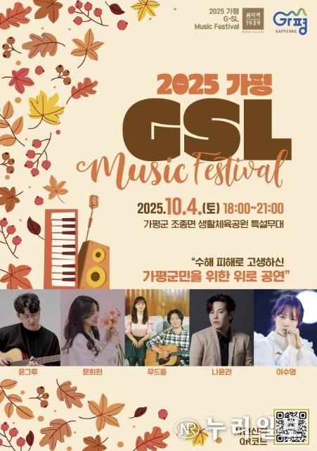 (누리일보) 가평군은 오는 10월 4일, 토요일 조종면 생활체육공원에서 ‘2025 가평 G-SL’ 뮤직페스티벌 공연을 개최한다. 올해 네 번째 G-SL 무대인 10월 뮤직페스티벌은 지난 여름 집중호우로 인한 피해로 지치고 고생한 군민들에게 위로와 희망의 메시지를 전하기 위해 조종생활체육공원 특설무대에서 열린다.