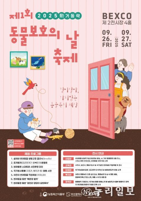 (누리일보) 농림축산식품부는 9월 26일 ~ 9월 27일 이틀간 부산 벡스코 제2전시장에서 ‘제1회 동물보호의 날’ 기념행사를 개최한다고 밝혔다.