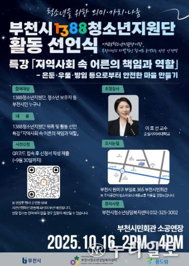 (누리일보) 부천여성청소년재단이 운영하는 부천시청소년상담복지센터는 시민의 자발적인 참여로 운영되는 청소년 민간 안전망의 활동을 공식화하기 위한 노력으로'1388청소년지원단 활동 선언식'을 2025.10.16. 부천시민회관에서 개최한다.