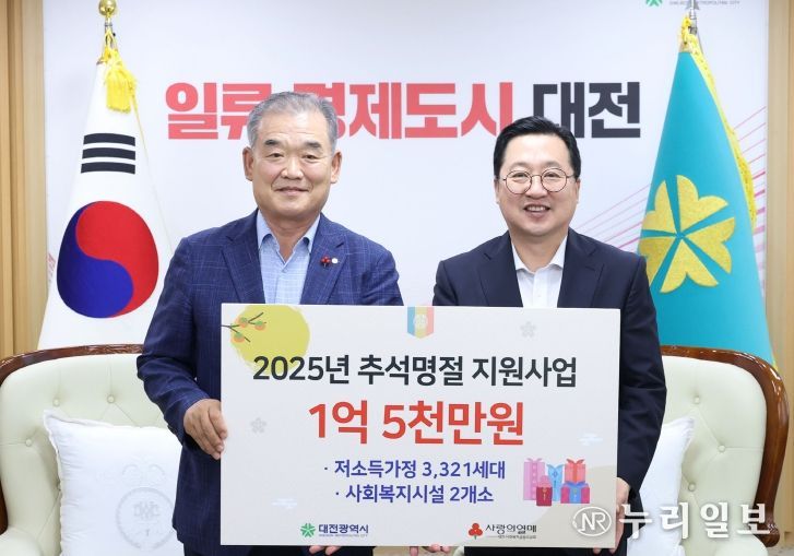 (누리일보) 대전시는 9월 22일 시청에서 대전사회복지공동모금회로부터 추석 명절을 맞아 저소득가정을 돕기 위한 성금 1억 5천만 원을 기탁받았다. 이날 행사에는 유재욱 대전사회복지공동모금회 회장이 참석해 이장우 대전시장에게 성금을 전달했다. 시는 기탁금 중 1억3,500만 원을 저소득 3,321가구에 현금으로 지원하고, 나머지 1,500만 원은 쪽방상담소와 이주외국인종합복지관의 명절맞이 행사에 사용할 계획이다.