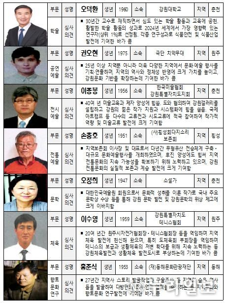 (누리일보) 강원특별자치도는 강원문화 발전과 향토문화 보존·증진에 기여한 유공자를 시상하기 위해 '제67회 강원특별자치도 문화상 심사위원회'를 개최하고, 7개 부문 7명의 수상자를 최종 확정했다고 밝혔다.