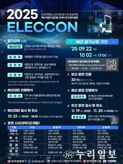 (누리일보) 한국전력(대표이사 사장 김동철)이 사이버보안 전문인력 양성과 에너지분야 협력체계를 강화하기 위하여 국정원 지부와 공동으로 ‘2025년 실전형 사이버공격 방어훈련’(ELECCON 2025)을 개최한다.