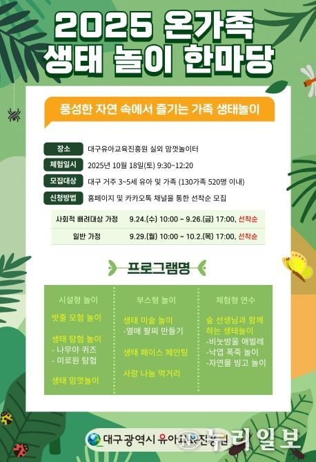 (누리일보) 대구유아교육진흥원은 오는 10월 18일 대구에 거주하는 유아와 동반가족 130가족을 대상으로 생태 체험 프로그램‘2025 온가족 생태놀이 한마당’을 운영한다.