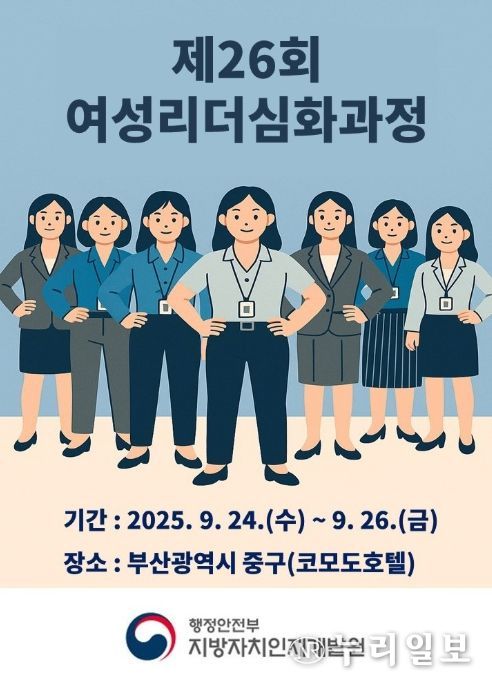 (누리일보) 행정안전부 지방자치인재개발원은 9월 24일부터 9월 26일까지 부산광역시에서 지방자치단체 여성공무원 200여 명을 대상으로 ‘제26회 여성리더심화과정’을 운영한다고 밝혔다.