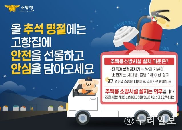 (누리일보) 소방청은 추석 명절을 앞두고 오는 9월 26일부터 2주간 ‘고향집에 주택용 소방시설 설치하기’ 캠페인을 전국적으로 추진한다고 밝혔다. 이번 캠페인은 주택용 소방시설 자율설치 문화를 확산시키고, 국민이 직접 안전한 고향집을 만드는 데 동참할 수 있도록 하기 위한 취지다.