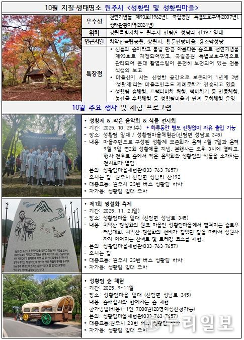 (누리일보) 강원특별자치도는 2025년 10월의 ‘지질·생태명소’로 원주시의 '성황림 및 성황림마을'을 선정했다고 밝혔다.