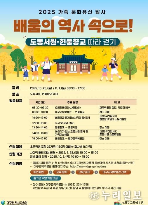 (누리일보) 대구교육박물관은 오는 10월 25일과 11월 1일, 두 차례에 걸쳐 초등학생 가족들을 대상으로 ‘배움의 역사 속으로! 도동서원·현풍향교 따라 걷기’가족문화유산답사 프로그램을 운영한다.