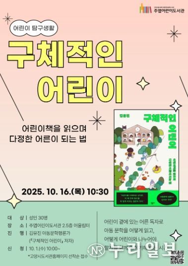 (누리일보) 고양특례시 주엽어린이도서관은 오는 10월 16일과 11월 5일 성인을 대상으로 인문학 강연‘어린이 탐구생활’을 진행한다고 밝혔다.