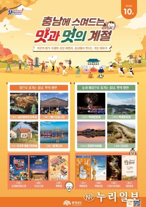 (누리일보) 충남도가 ‘2025∼2026 충남 방문의 해’를 맞아 운영 중인 ‘월간 충남’을 통해 ‘충남에 스며드는 맛과 멋의 계절’이라는 주제로 10월 가볼 만한 도내 여행지를 안내한다.