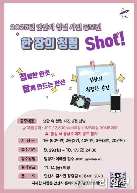 (누리일보) 안산시는 청렴문화 확산과 시민 공감대 형성을 위해 ‘2025 한 장의 청렴, Shot! 사진 공모전’을 개최한다고 30일 밝혔다.