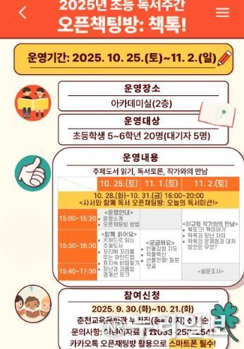 (누리일보) 춘천교육문화관은 책 읽기 좋은 계절인 가을을 맞아 오는 10월 25일, 10월 28일부터 11월 2일까지 초등학생 5~6학년 학생 20명을 대상으로 초등 독서주간 ‘오픈책팅방 책톡!’을 운영한다.