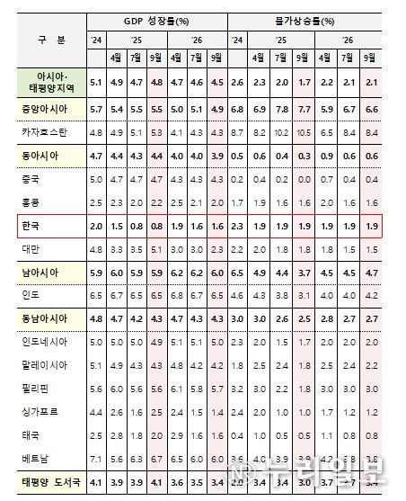 한편, 아시아개발은행은 한국의 ’25년 성장률에 대해서는 7월에 발표한 전망치인 0.8%를 유지했다. 7월 전망은 건설투자 감소, 수출 둔화, 부동산시장 약세 등을 반영하여 4월 전망에 비해 0.7%p 하향 조정된 바 있다. 아시아개발은행은 건설경기 부진, 미국의 관세 인상 및 관련 불확실성 등이 지속되면서 7월 전망치를 유지했으나, 정부의 확장적 재정정책과 완화된 통화정책은 하반기 내수 회복에 기여할 것이라고 평가했다. 아울러 ’26년 경제성장률도 7월과 동일한 1.6%로 전망했다.
