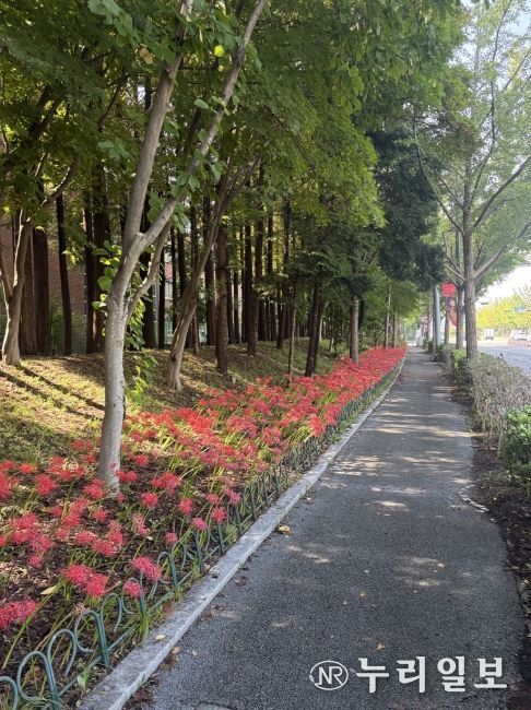 상록수 숲길과 어우러진 꽃무릇이 산책길을 물들이며, 정자와 쉼터, 야간 조명도 설치돼 있어 낮과 밤 모두 즐기기 좋은 산책 코스다.
