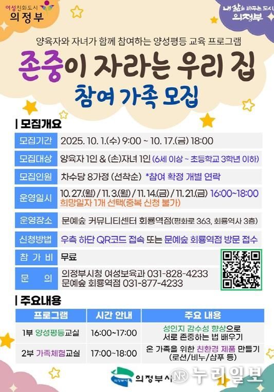 (누리일보) 의정부시는 가정 내 존중과 배려의 문화를 확산하기 위해 문예숲 커뮤니티센터 회룡역점 프로그램 ‘존중이 자라는 우리 집’에 참여할 가족을 모집한다.