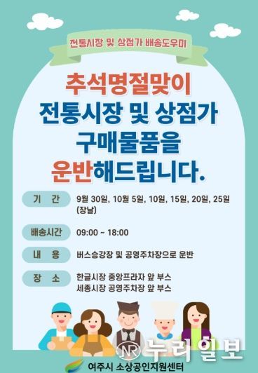 (누리일보) 여주시는 여주시소상공인지원센터 주관으로 다가오는 추석 명절을 맞이하여 전통시장과 상점가를 찾는 시민들의 편의를 돕고 전통시장 활성화를 위해 ‘전통시장 및 상점가 배송 도우미’ 서비스를 운영한다.