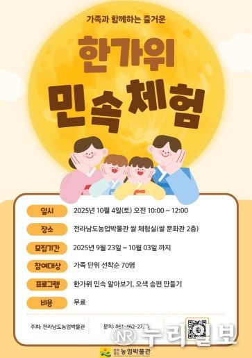 (누리일보) 전라남도 농업박물관은 다가오는 한가위를 맞아 가족 단위 관람객 대상으로 ‘한가위 민속 체험행사’를 10월 4일에 개최한다고 밝혔다.