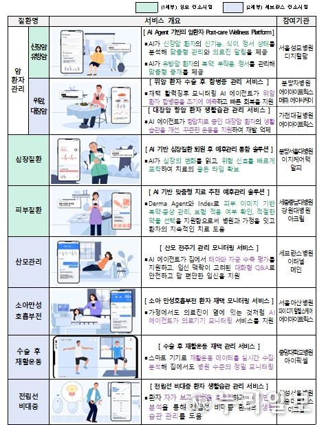‘의료AI 혁신 생태계 조성(닥터앤서3.0)’ 사업은 환자가 일상으로 복귀한 이후에도 주도적으로 예후를 관리할 수 있도록 AI가 돕고, 응급상황 시 의료진이 적시에 개입할 수 있도록 지원하는 서비스 개발‧실증 사업이다. 당초 ’25년도 예산 규모(23억원)에 따라 유방‧신장암, 심장질환 등 4종의 재활‧만성 질환을 선정했으며, 하반기 추경(40억원 증)을 계기로 위암‧대장암, 산모 질환 등 6종의 질환을 추가 선정하여 총 10종 질환에 특화된 AI 예후 관리 서비스를 개발한다.