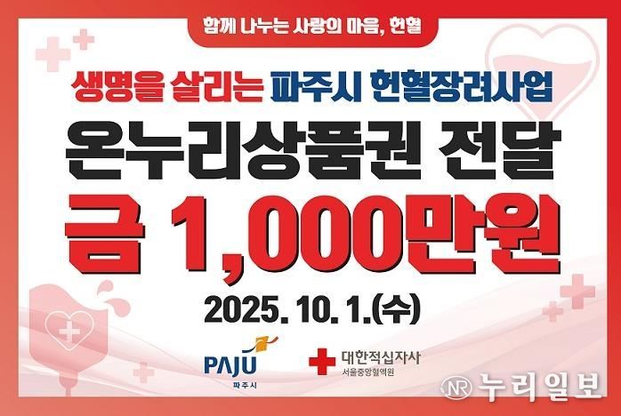 (누리일보) 파주시는 지난 1일 대한적십자사 서울중앙혈액원에 1천만 원 상당의 헌혈장려지원금 상품권을 전달했다.