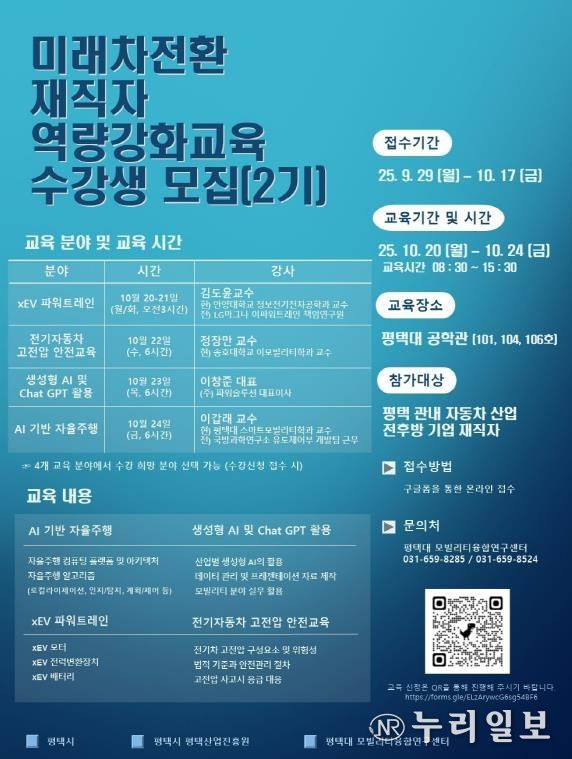 (누리일보) 평택시와 평택산업진흥원이 ‘미래차 전환 재직자 역량 강화교육’ 2기 과정을 개설한다. 교육은 10월 20일부터 24일까지 교육 운영기관인 평택대학교에서 진행되며, 지역 자동차 산업 재직자를 대상으로 미래차 핵심 분야 전문지식을 제공한다.