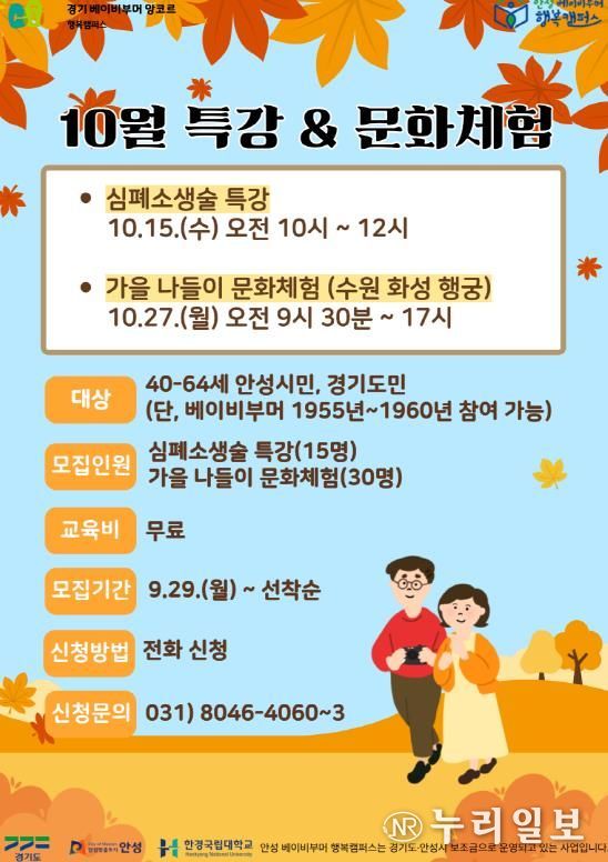 (누리일보) 안성 베이비부머 행복캠퍼스(한경국립대학교 평생교육원)는 오는 10월 15일부터 27일까지 중장년 안성시민(경기도민)을 대상으로 ‘10월 특강(심폐소생술) 및 문화체험(수원화성행궁)’ 프로그램을 운영한다고 밝혔다.