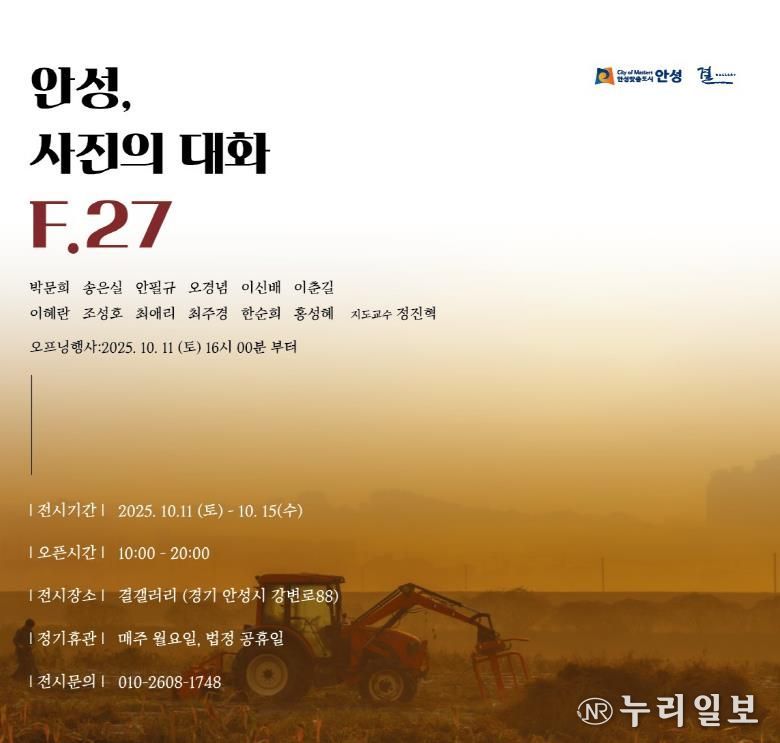(누리일보) 안성시 사진동아리 F.27 photo가 오는 10월 11일부터 15일까지 안성천 작은미술관 결갤러리에서 전시회 ‘안성, 사진의 대화 F.27’을 개최한다. 이번 전시는 동아리 회원 18명이 참여해 안성의 자연환경과 사람들의 이야기를 기록한 작품을 선보인다.